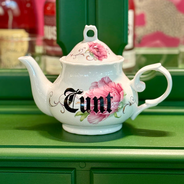 Quick shop Cunt | Vulgar vintage style blue floral tea cup and saucer set with metallic gold lettering $27.00