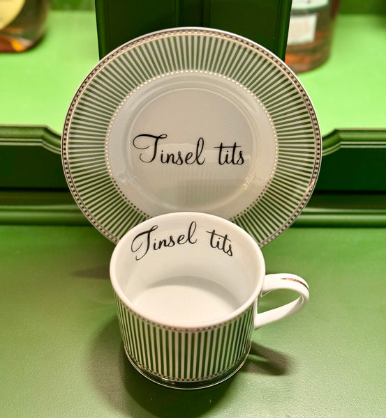 Quick shop Tinsel tits | Vulgar vintage style green candy stripe cappuccino/tea cup and saucer set $30.00