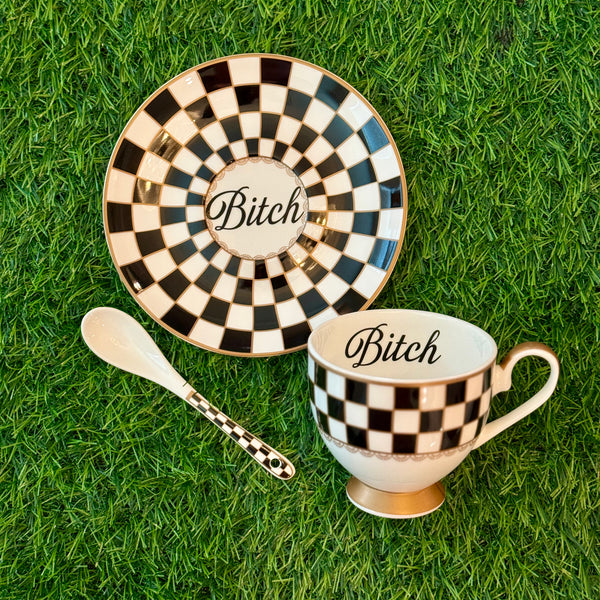 Quick shop Bitch | vulgar vintage style floral black checkered china tea cup with matching saucer and spoon $35.00
