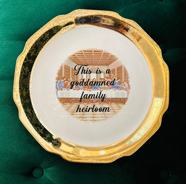 Quick shop This is a goddamned family heirloom | vulgar vintage Last Supper 14in serving plate with gold detail and hanging bracket $50.00