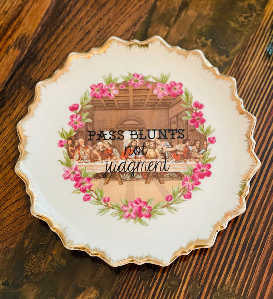 Quick shop PASS BLUNTS not judgment | vulgar vintage ornate last supper decorative plate/rolling tray $40.00