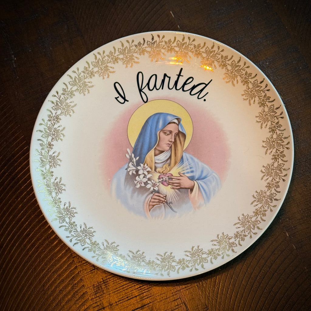 I farted. | vulgar vintage 13in Mary plate with gold reticulated edge detail Exactly as pictured. One of a kind! Ready to shipHand wash only.Do not microwave. Made with ❤️, so handle with care!