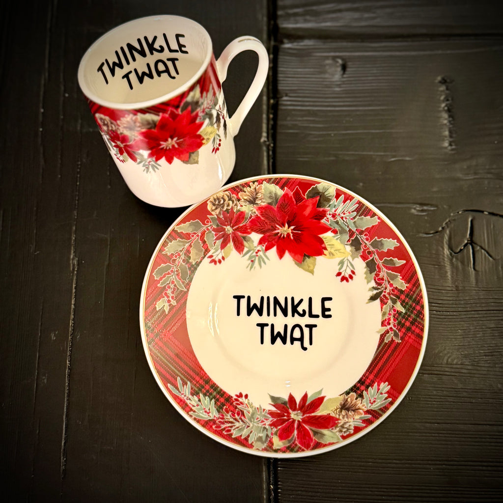 Twinkle Twat | Vulgar vintage holiday holly demitasse tea cup and saucer set