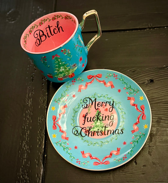 Quick shop Merry fucking Christmas, Bitch. | Vulgar vintage holiday mid mod print tea cup and saucer $45.00