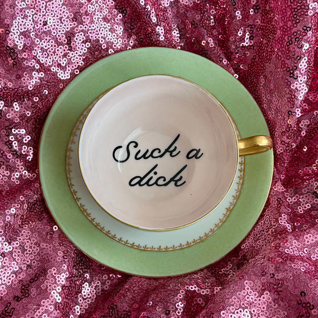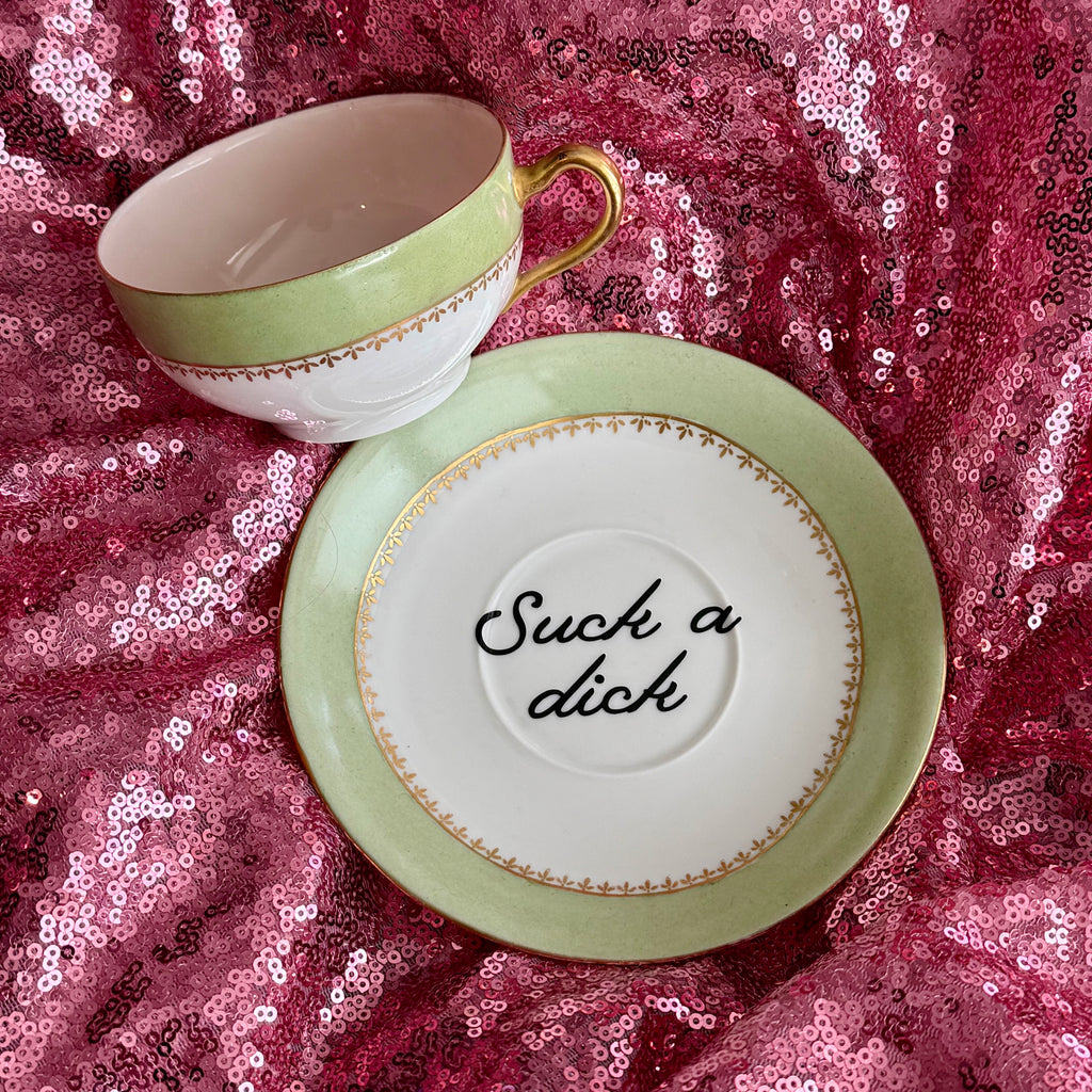 Suck a dick | Vulgar antique green rim tea cup and saucer setExactly as pictured. Hand wash only.Do not microwave. Made with ❤️, so handle with care!