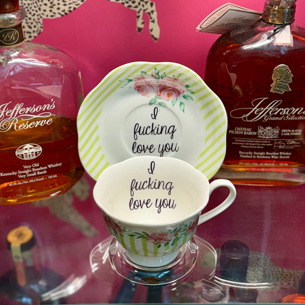 Quick shop Bitch | vulgar vintage style floral black checkered china tea cup with matching saucer and spoon $35.00