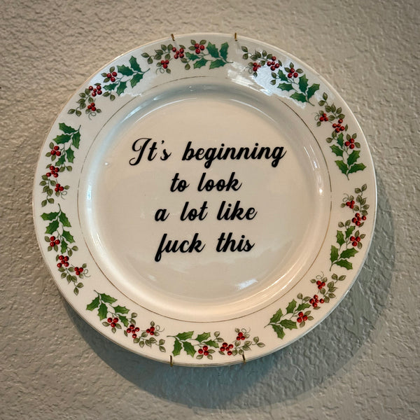 Quick shop It’s beginning to look a lot like fuck this. | vulgar vintage holiday holly 10in decorative dinner plate with hanging bracket $40.00