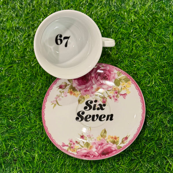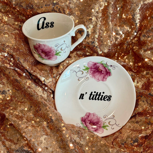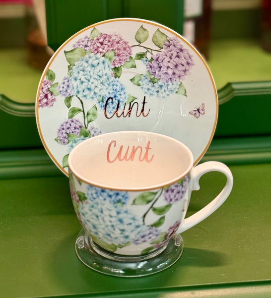 Quick shop Cunt | Vulgar vintage style hydrangea tea cup and saucer set with metallic rose gold lettering $27.00