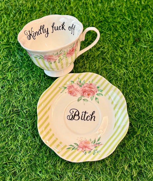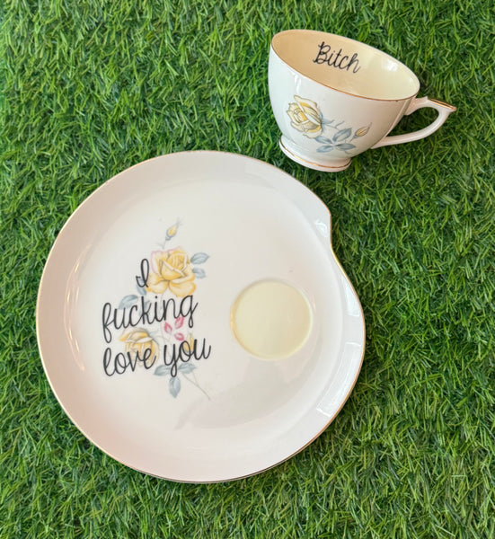 Quick shop I fucking love you, bitch | vulgar vintage 1930’s hand painted Lefton china tea cup and snack plate $42.00