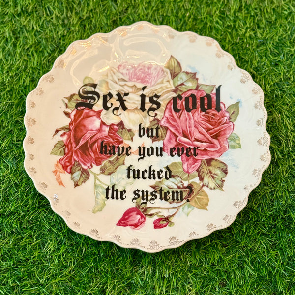 Quick shop SEX IS COOL but have you ever fucked the system? | vulgar vintage hand painted rose 11in plate $40.00