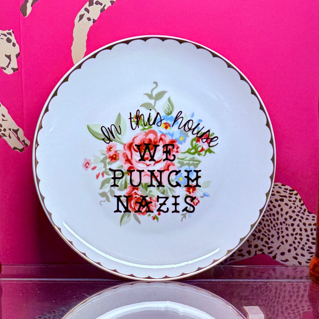 In this house WE PUNCH NAZIS | vulgar vintage vining rose 10in plate Exactly as pictured. one of a kind.