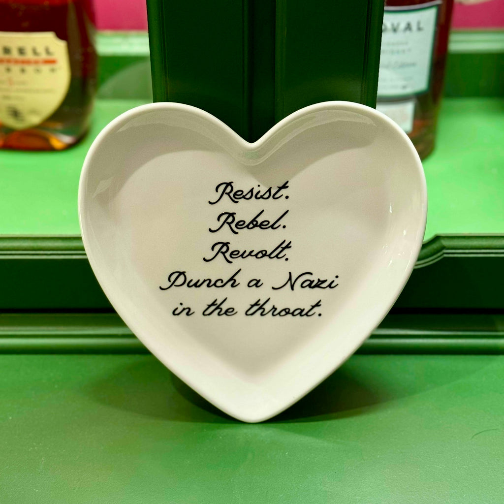 Resist. Rebel. Revolt. Punch a Nazi in the throat. | vulgar vintage white 6in heart plate