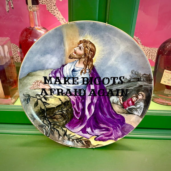 Quick shop MAKE BIGOTS AFRAID AGAIN | vulgar vintage 11in decorative hand painted Jesus plate with hanging bracket $50.00