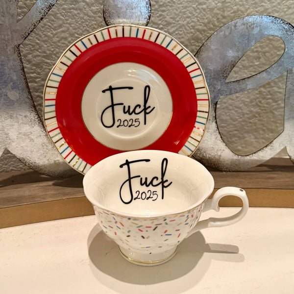 Fuck 2025 | vulgar vintage style confetti print cup and saucer set
