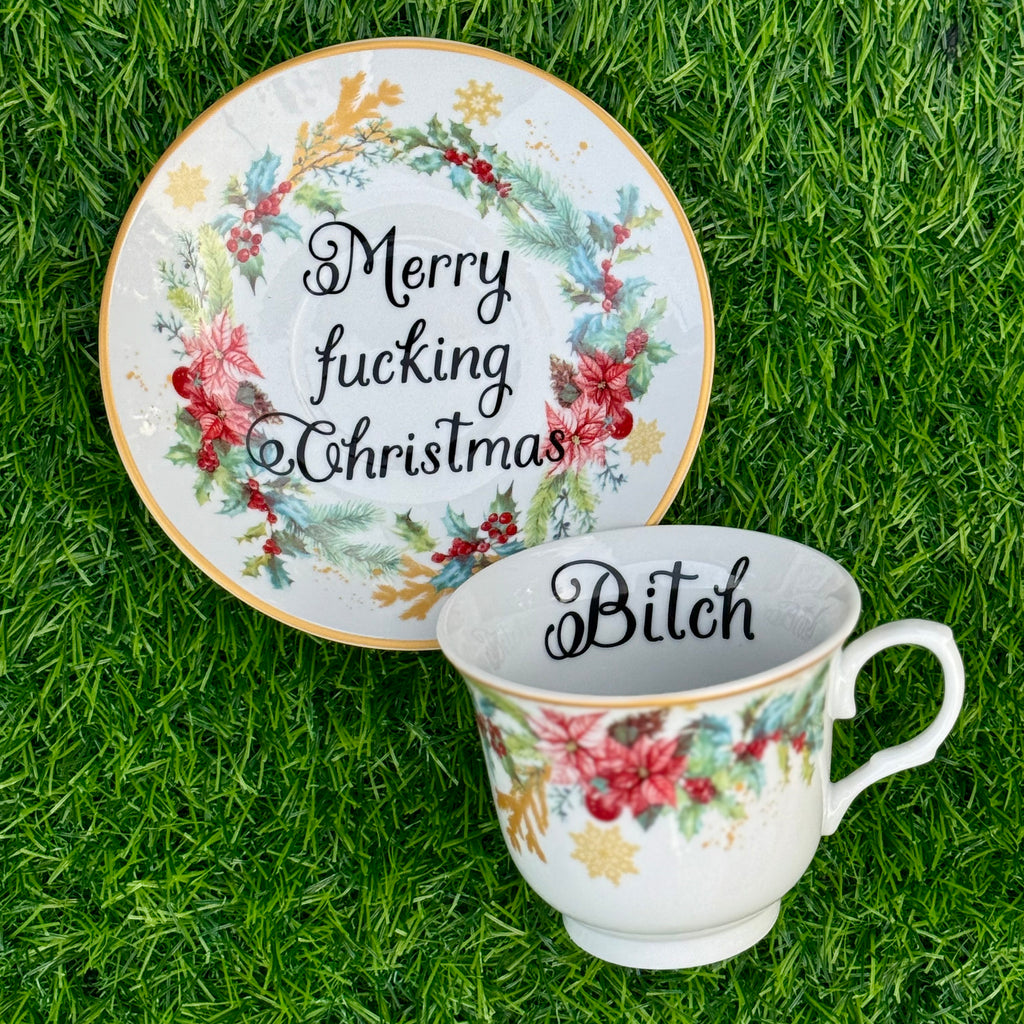Merry fucking Christmas, Bitch. | Vulgar vintage holiday print tea cup and saucerVintage fine china. exactly as pictured. Hand wash only. Do not microwave.Made with ❤️, so handle with care!